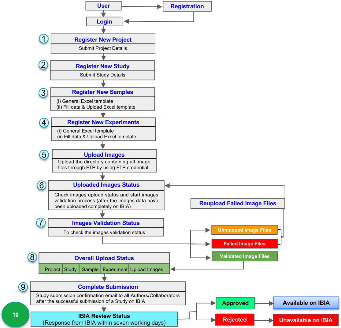 As depicted in the figure above, the data submission on IBIA is a simple ten step process. The submitter has to Register on IBIA (if not already registered) which is followed by Login. After successful Login, the submitter need to submit/upload Project, Study, Samples and Experiments information on IBIA. Thereafter, actual image files are uploaded by submitter, through the IBIA "Upload Images" module, using the FTP credentials. As soon as all the images are uploaded successfully on IBIA, "Uploaded Images Status" option is used to verify the upload size (in terms of server disk space utilized). The submitter has to press "Start Validation" button to start and ensure the integrity and accuracy of upload. After successful validation of all the uploaded images, submitter should ensure about the upload of all required data through "Overall Upload Status" option provided on IBIA website. If all the required information is filled completely on "Project", "Study", "Sample", "Experiment" and "Upload Images"/"File Upload" sections, the submitter will finally confirm the submission on IBIA through "Complete Submission". An automatically generated email will be send to inform all the Authors/Collaborators and IBIA review committee, about the submission of the a new Study (only after the successful submission). Finally, submitted study passes through various quality, suitability, and integrity checks of IBIA to match the archive standards. Thus, the decision on a finally submitted study (approval/rejection) is made within seven working days by the IBIA review committee. After the decision, an approved study will be available in the IBIA's "Study Browse" list and an email will be sent immediately to the submitters about the review decision (approval/rejection) for the study. The studies with "Open Access" licence type will be available for the public use (after the "Study Release Date"). If the submitted study is Rejected, this will be unavailable to IBIA users.